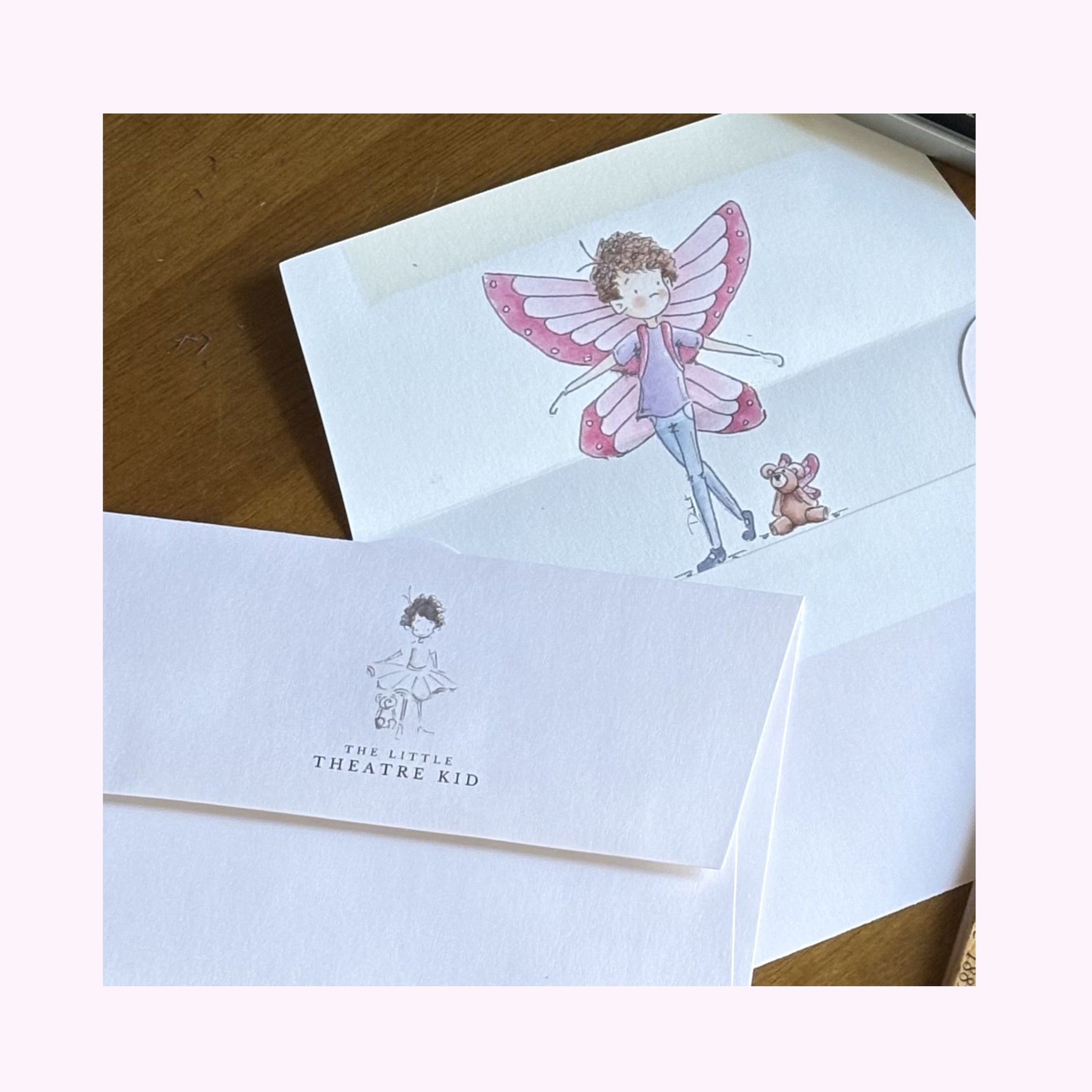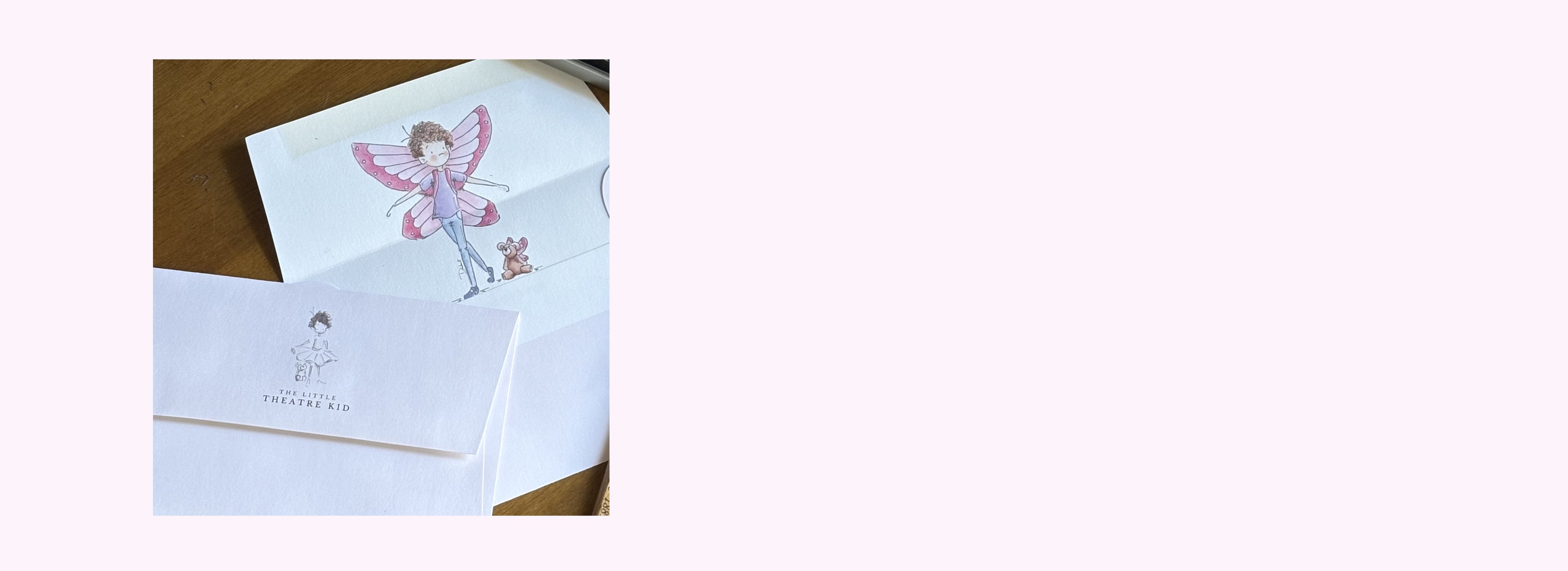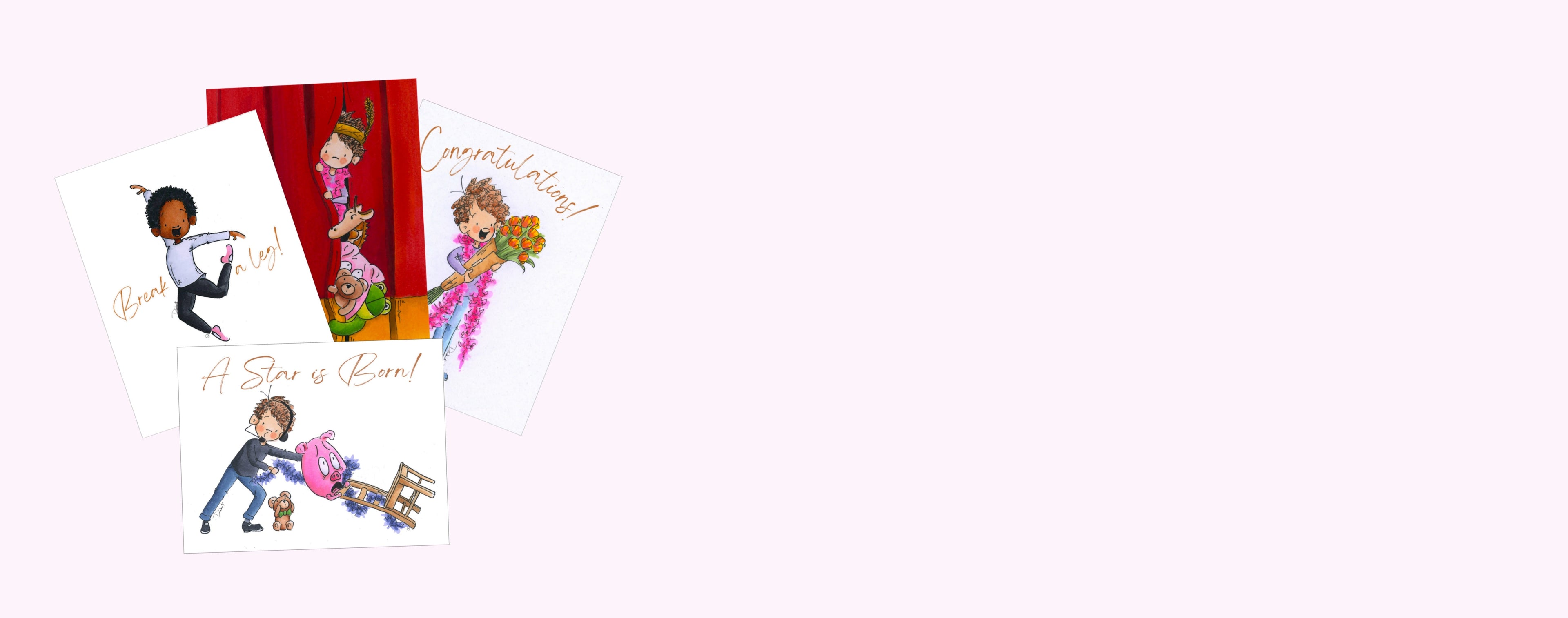 A series of greeting cards from The Little Theatre Kid collection can be purchased at The Museum of Broadway and The Drama Book Shop (both located near Times Square in NYC). These cards feature the a customized bonus pink envelope with a surprise image tucked away inside!